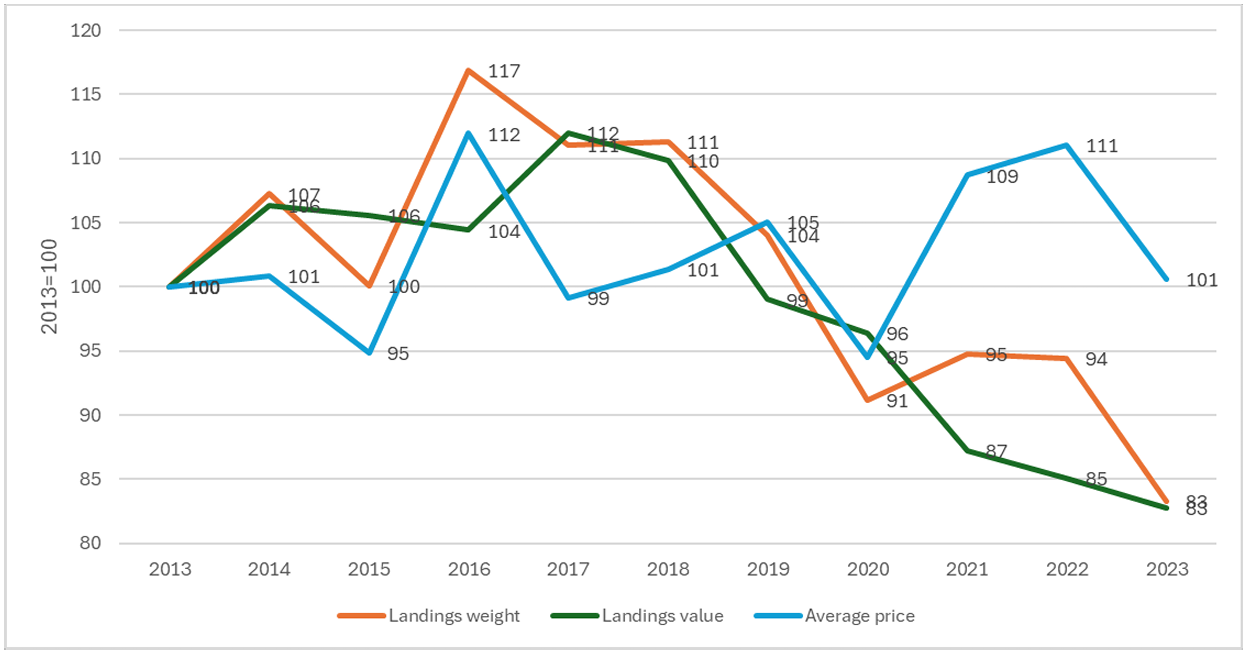 Variations on landings in weight and value and average landed price (based on 2013=100). Member States data submissions under the 2025 Fleet Economic data call. (click on the image to enlarge ot)
