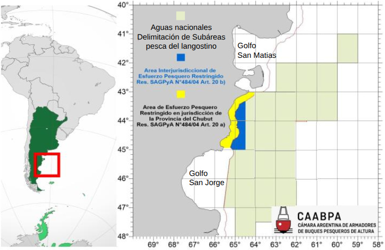 El CFP regula la pesca del langostino en aguas nacionales mediante la delimitación de Subáreas específicas dentro de la Zona de Veda Permanente de Juveniles de Merluza (ZVPJM), estableciendo fechas de apertura y cierre basándose en prospecciones del INIDEP. Haga clic sobre la imagen para ampliarla
