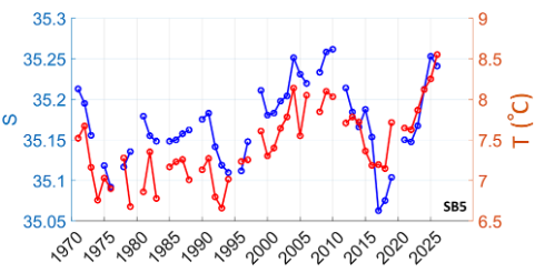 En las estaciones más externas LB8 y KG6, ubicadas dentro de la influencia de la East Greenland Current (Corriente de Groenlandia Oriental), los investigadores registraron temperaturas extremadamente bajas y salinidad récordmente baja. Estas aguas están fuertemente influenciadas por el derretimiento del hielo ártico, que hace que el océano sea más fresco y más frío.
