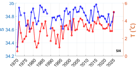 Temperatura (rojo) y salinidad (azul) en Siglunes 4 de los estudios invernales de 1970 a 2026 (promedios de profundidad de 0 a 200 m), que muestran el calor récord en febrero de 2026. Fuente: Hafrannsóknastofnun