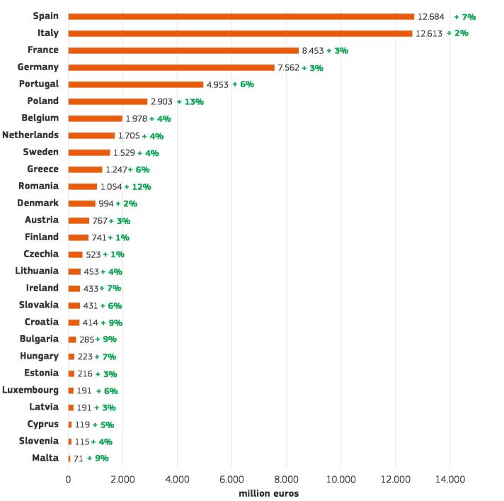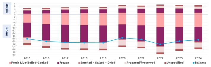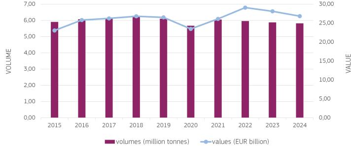 Imports totalled 5.9 million tonnes worth €29.9 billion, a 1% decrease in real-terms value and a slight 0,3% increase in volume compared to 2023. Exports grew slightly (1% to €8,25 billion), despite volumes hitting their lowest level since 2019 at 2,2 million tonnes.