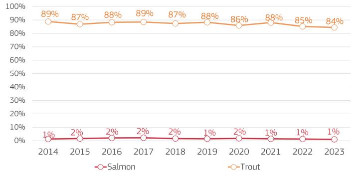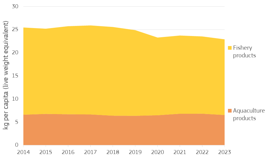 Apparent consumption in the EU (the sum of catches, aquaculture production and imports minus exports) fell to 22.89 kg per capita in 2023, the lowest level recorded in ten years, and a 3% decrease compared to 2022. Consumption of wild products was 16.35 kg per capita, the lowest level in a decade, while consumption of farmed products was 6.53 kg per capita. Portugal remained the highest consumer per capita in Europe, at 53.61 kg in 2023.