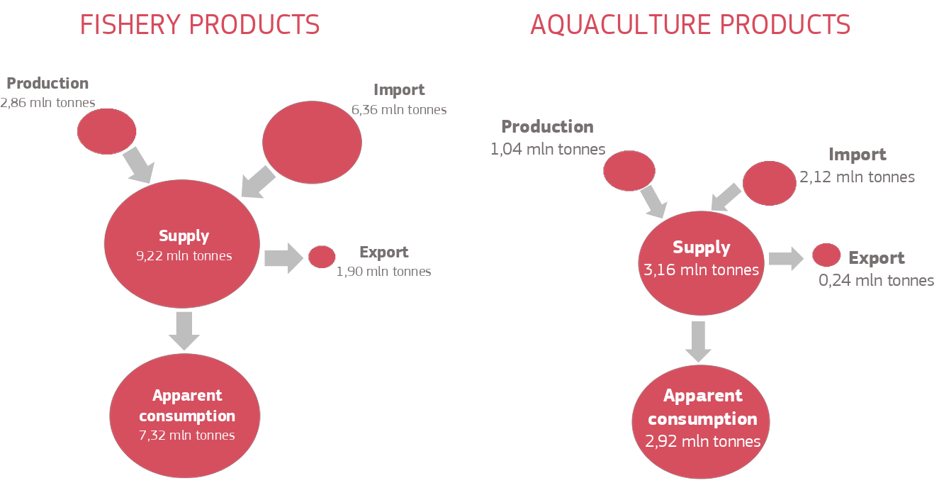 Intra-EU trade in fishery and aquaculture products is characterised by significant trade exchanges, although slowing in 2024, with the total volume and value down by 1% to 5,8 million tonnes and €31,7 billion.