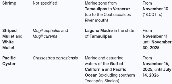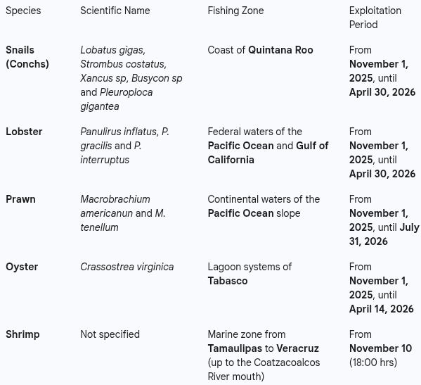 The Secretariat of Agriculture and Rural Development (SADER), through the National Commission of Aquaculture and Fisheries (Conapesca), has announced the implementation of seven new exploitation periods (open seasons) and the start of two closed seasons (vedas) for various marine species in November of 2025. These measures, based on the technical opinion of the Mexican Institute for Research in Sustainable Fisheries and Aquaculture (IMIPAS), aim to guarantee the responsible utilization and conservation of aquatic resources in Mexico.