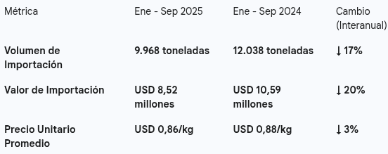 A pesar de la desaceleración acumulada, septiembre de 2025 experimentó un drástico repunte mensual, con las importaciones disparándose a 1.448 toneladas—un aumento del 134% con respecto a las 620 toneladas de septiembre de 2024. El valor siguió el mismo camino, subiendo un 193% hasta USD 1,34 millones durante el mes. Este aumento mensual sugiere un reabastecimiento intermitente o una recuperación estacional que hizo poco para compensar la caída general en lo que va del año.