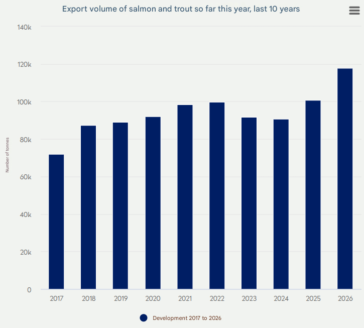 增长与中国春节密切相关,这是中国在节前和节日期间三文鱼消费最旺盛的时期。2026年春节为2月16日,官方假期从2月15日至2月23日。