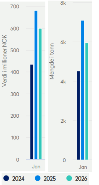 Poland emerged as the strongest growth market by value, with exports rising NOK 424 million (about USD 40 million), a 42% increase year-on-year. Export volumes to Poland reached 17,071 tonnes, marking a sharp 71% increase compared with January last year.