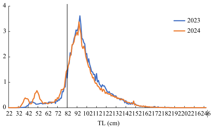 Frequency distributions of Patagonian toothfish lengths weighted by total catch by the trawl fleet (A) and longline fleet (B). Years 2000 and 2003-2023. The vertical line indicates the minimum catch length established by regulations based on the species’ length at first sexual maturity (TL50%: 82 cm). Source: INIDEP/MAFIS