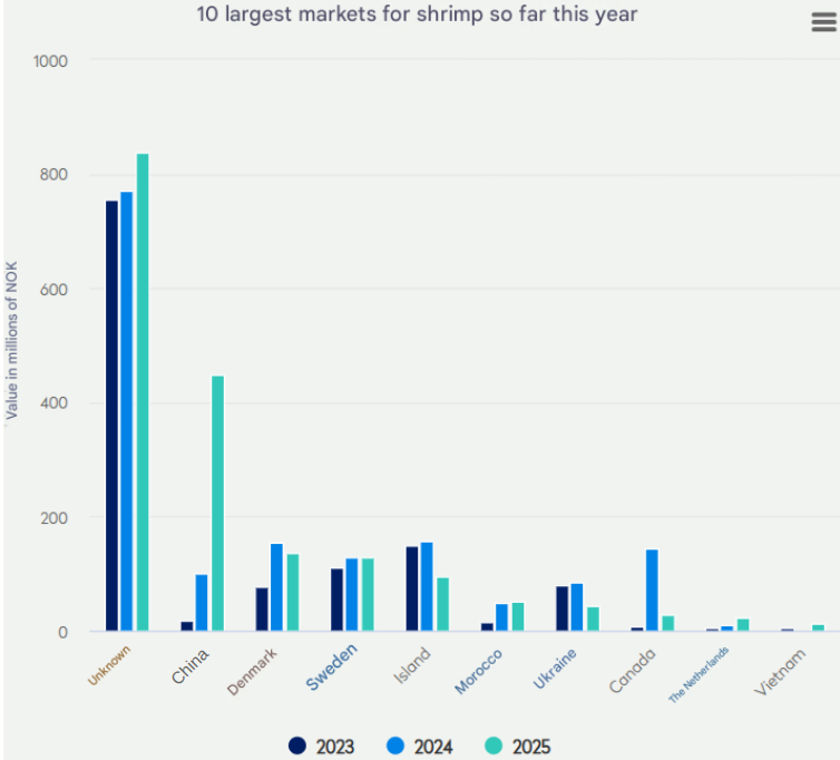 In terms of destination markets, China, Iceland, and Denmark were the largest buyers by volume. However, China stood out as the fastest-growing market, bolstered by tariffs on Canadian prawns and an surging demand for raw consumption.