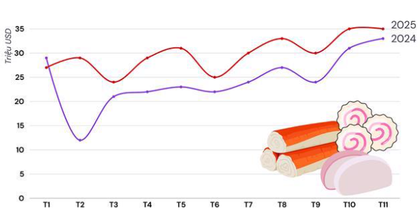 Data from Vietnamese Customs reveals that in the first 11 months of 2025, the total export value of fish paste and surimi reached US$327 million, marking a 22% increase over the same period in 2024. November 2025 alone contributed US$35 million to this total, a 5% rise year-on-year.