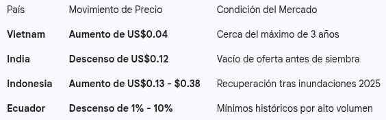 En Indonesia, hay signos de una frágil recuperación. En Java Oriental, los precios para varios calibres subieron entre 2,000 y 6,000 IDR (US$0.13 a US$0.38) por kilogramo. No obstante, estas cifras siguen siendo entre un 13% y un 18% más bajas que las del año pasado. La industria aún se recupera de las secuelas de las inundaciones de 2025 y de las estrictas políticas de monitoreo de radiación implementadas por Japón, que han obstaculizado los flujos de exportación.