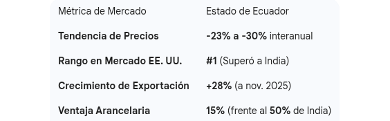 Al aprovechar un arancel competitivo del 15% en comparación con el impuesto del 50% que enfrentan sus homólogos indios, Ecuador se ha convertido oficialmente en el principal proveedor de los Estados Unidos.