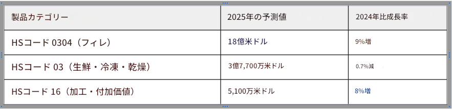 高度加工の推進:加工パンガシウス(HS16)は8%成長したものの、依然として全体に占める割合は小さい。2026年の成功は以下の点にかかっている。