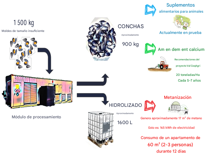 Para maximizar la eficiencia y el beneficio ambiental, el proyecto, desarrollado por productores de mejillón e investigadores como Cultimer, utiliza una unidad de procesamiento móvil. Esta unidad puede desplegarse directamente en las granjas de mejillones, eliminando la necesidad de transporte a larga distancia de residuos orgánicos pesados y húmedos.