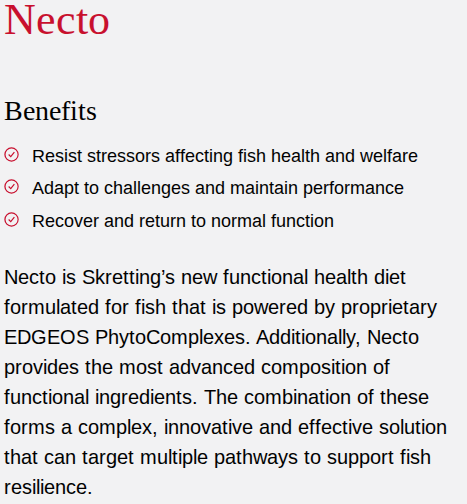 The aquaculture industry’s focus has shifted from disease resistance toward overall welfare and resilience—the ability of fish to withstand and cope with challenges like stress, environmental issues, and infections. Necto addresses this by going beyond traditional feed.