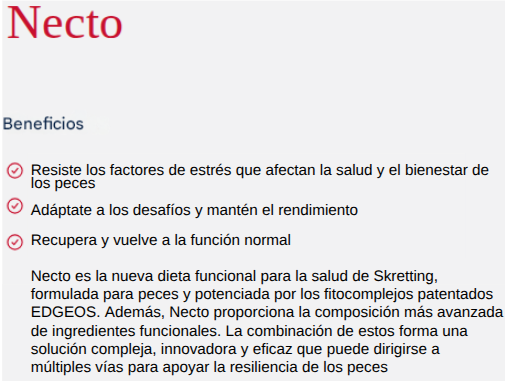 El enfoque de la industria acuícola ha pasado de la resistencia a las enfermedades al bienestar general y la resiliencia, es decir, la capacidad de los peces para soportar y hacer frente a desafíos como el estrés, los problemas ambientales y las infecciones. Necto aborda esto yendo más allá de las formulaciones tradicionales de alimentos.