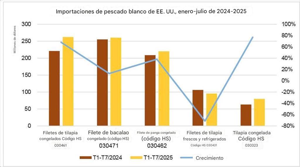 Estados Unidos es uno de los mercados de consumo de pescado blanco más fuertes del mundo. Según datos del Centro de Comercio Internacional (ITC), en los primeros siete meses de 2025, las importaciones estadounidenses de pescado blanco superaron los $1.100 millones de USD, lo que representa un aumento significativo del 42% con respecto al mismo período del año anterior. La tilapia, el bacalao y el pangasius se consideran las especies de pescado blanco más populares en EE. UU., según informó VASEP (la Asociación de Exportadores y Productores de Productos del Mar de Vietnam).