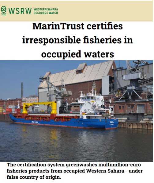 Una porción significativa del sector de productos pesqueros en el Sáhara Occidental lleva la certificación MarinTrust. No obstante, una revisión de WSRW sugiere que los certificados carecen tanto de credibilidad como de transparencia, señalando errores graves en todos los documentos del certificado.