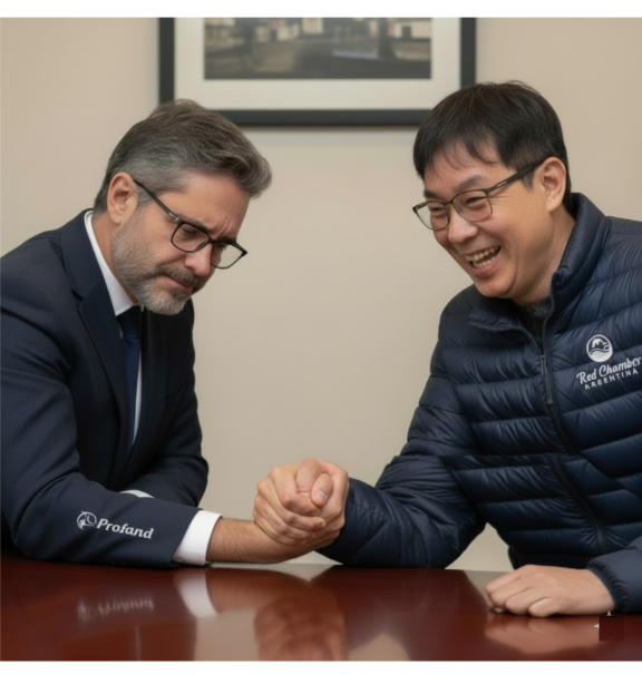 Artificially generated image showing Marcelo Mou, president of Red Chamber, happy because he is winning the 'power struggle' against the president of Profand, Enrique García -->
