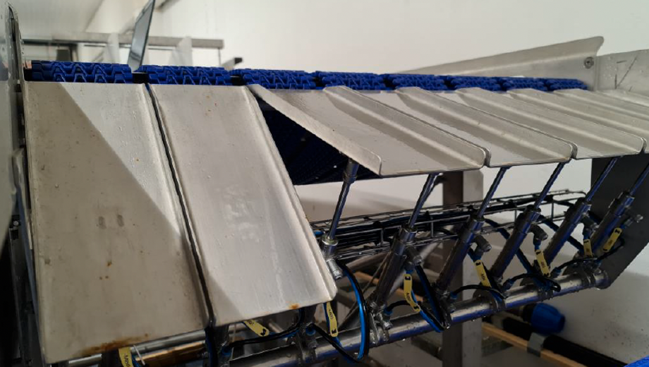 The pilot machine is engineered with a receiving belt and a grading unit comprising eight parallel tracks. Fish are singulated—separated into single units—using three belts with increasing speed before passing over weighing zones equipped with load cells. Once the weight is recorded, pneumatic sliding flaps guide the fish into the correct category. The entire system is managed by a PLC solution featuring a calibration function and a visual control panel. The machine's construction uses hygienic, stainless material, adhering to the stringent requirements of the food industry.