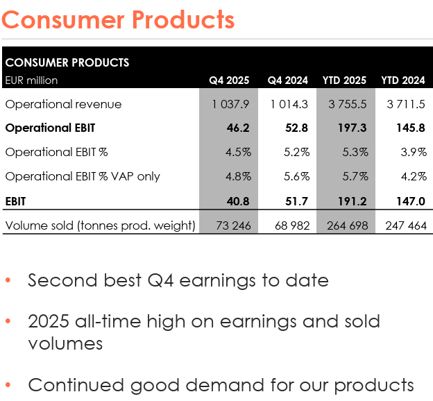 The company’s downstream processing arm, Mowi Consumer Products, achieved operational EBIT of €197 million (approximately $215 million USD) in 2025, alongside record volumes of 265,000 tonnes (product weight).