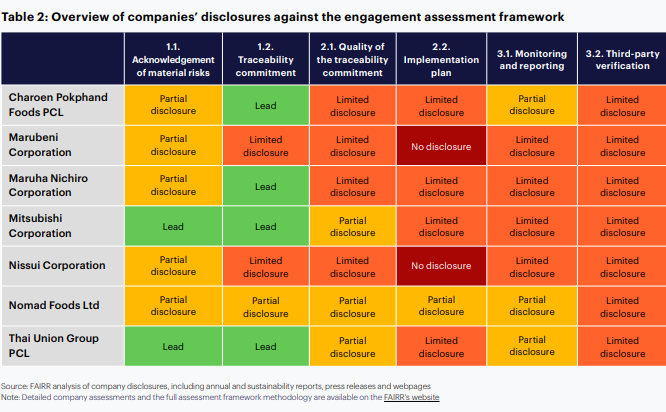 Four of the seven companies have now doubled their traceability commitments since Phase 1. In 2025, Maruha Nichiro and Mitsubishi disclosed new commitments, joining Thai Union and Charoen Pokphand Foods.