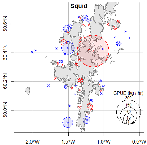The high squid catches were concentrated in specific nearshore areas and were more patchily distributed elsewhere in the survey.