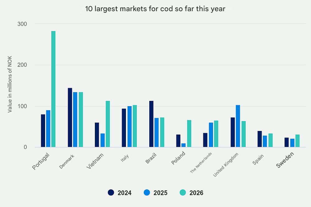 Exports to Vietnam increased by USD 8.3 million, or 235 per cent, reaching 1,055 tonnes, a 141 per cent increase year on year. Vietnam serves primarily as a processing hub, re-exporting frozen cod fillets to the USA and UK.