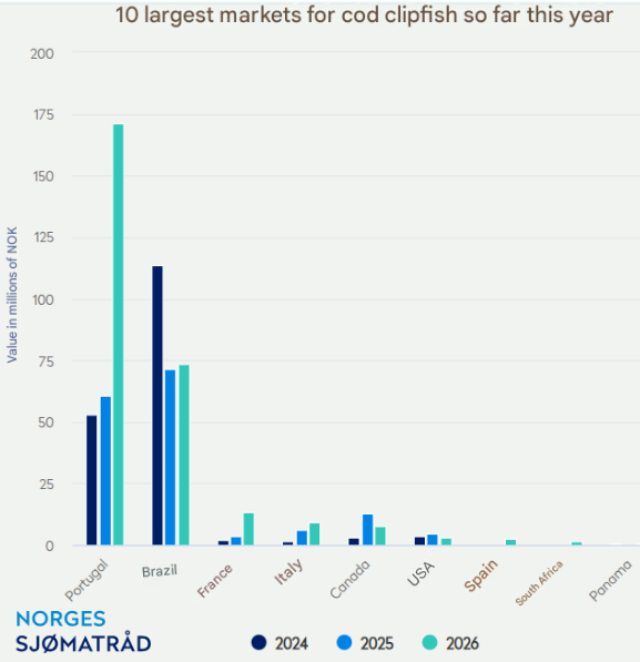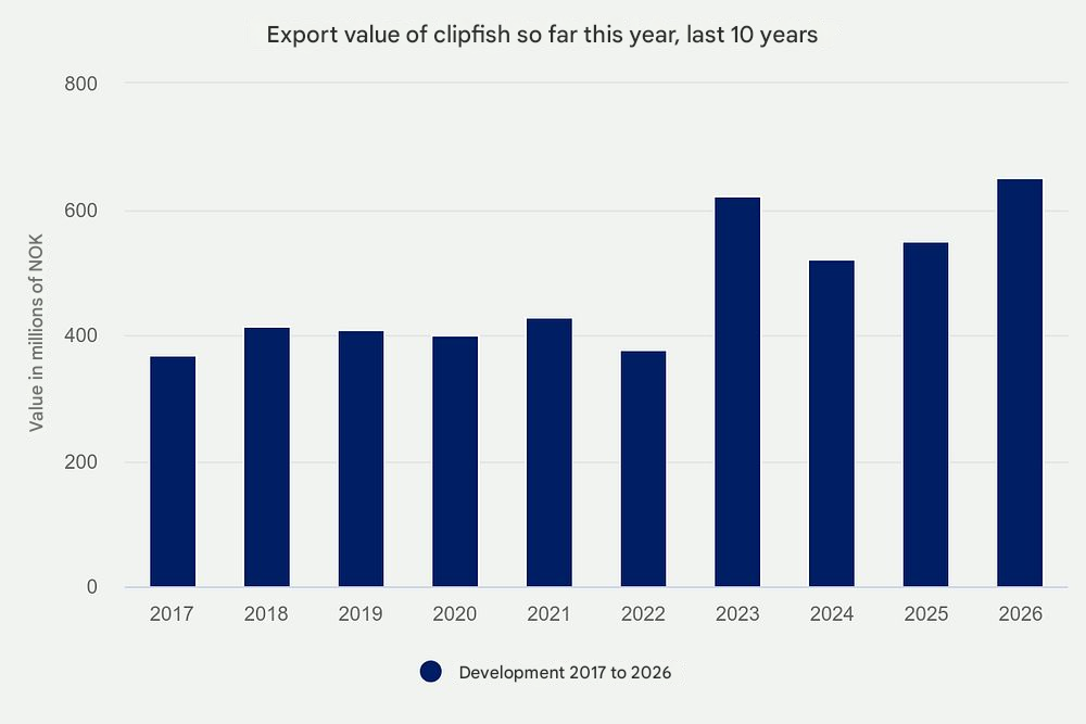 Exports of cod clipfish increased sharply, with volumes up 63 per cent to 1,585 tonnes, and export value rising 77 per cent to USD 29.3 million (NOK 284 million).