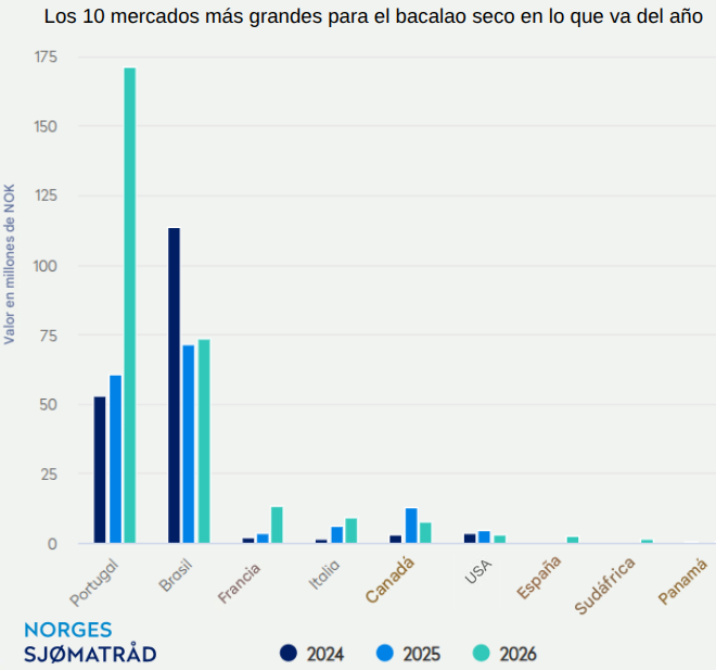 - Noruega exportó 307 tonseladas de bacalao seco (stockfish) por un valor de USD 11,8 millones ( NOK 114 millones ) en enero .