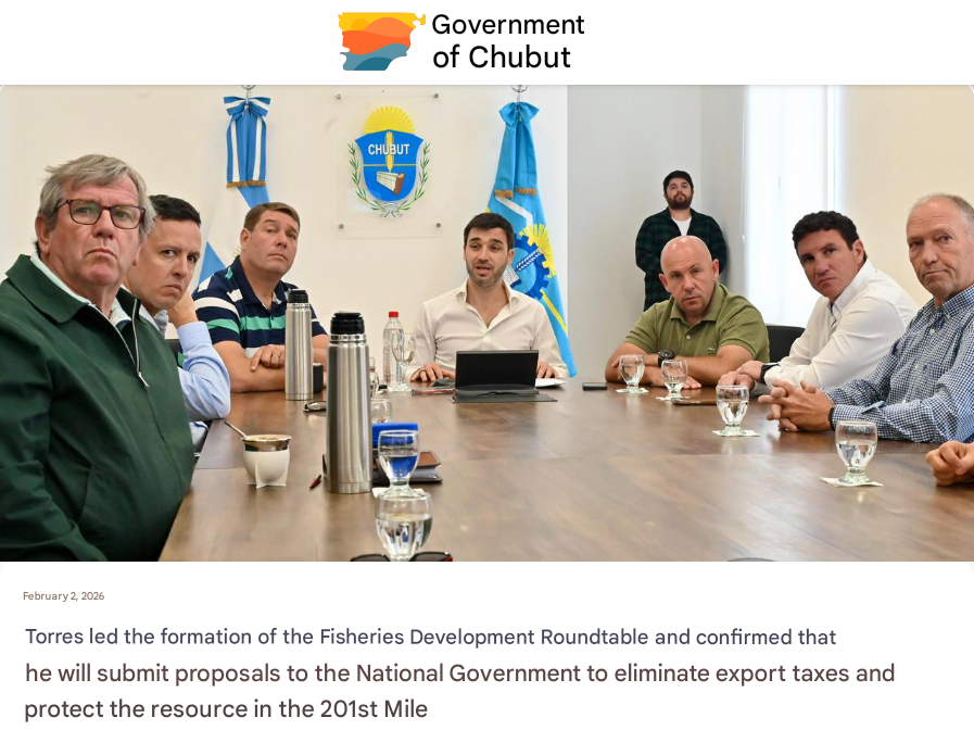 チュブ州知事イグナシオ「ナチョ」トーレスは、州政府庁舎において、漁業開発円卓会議の設立を主導した。この戦略的な場から、国家政府に対し、漁業輸出に対する関税の撤廃、マイル201における資源保護の強化、そして南大西洋におけるアルゼンチンの主権強化を目的とした提案が提出される。