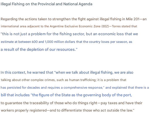 状況室で行われた会合において、知事は、アルゼンチン排他的経済水域(AEEZ)における違法漁業が、1シーズンあたり6億米ドルから10億米ドルの損失を生み出しており、その影響は主にチュブ州に及んでいると警告した。