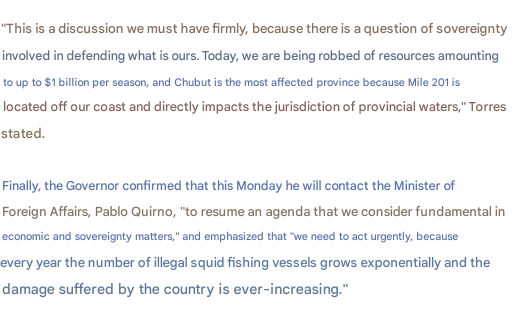 トーレス知事は、この**月曜日(本日)**に、国家外務大臣パブロ・キルノと連絡を取ることを確認し、「経済および主権の観点から不可欠と考える議題を再開するため」と述べ、「緊急に行動する必要がある。なぜなら、毎年違法イカ釣り漁船の数が指数関数的に増加し、国が被る被害がますます大きくなっているからだ」と強調した。