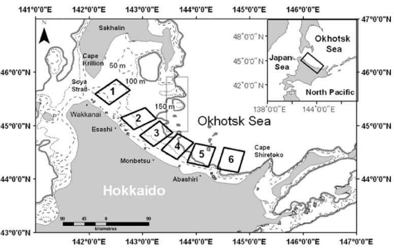 Mapa del área de estudio que ilustra la región de cultivo de vieiras a lo largo de la costa de Hokkaido, Japón, con áreas submuestreadas indicadas por recuadros y un número de ubicación asociado. Las curvas de nivel indican la profundidad (m). El recuadro discontinuo indica la ubicación de donde se extrajeron las velocidades medias de la corriente geostrófica (cm s²¹) y la tensión del viento (N m²²). Fuente: Tukimat Lihan