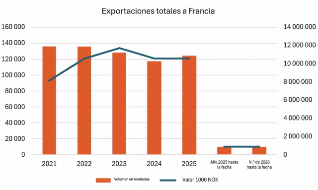 En 2025, Noruega exportó productos del mar a Francia por un valor aproximado de NOK 10 mil millones (alrededor de US$940 millones), lo que convierte a Francia en uno de los mercados más importantes para los productos del mar noruegos.