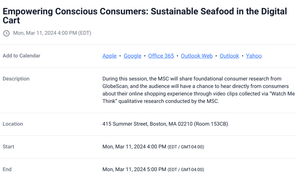 La sesión (Empoderando a los consumidores conscientes: productos del mar sostenibles en el carrito digital) se llevará a cabo el lunes 11 de marzo de 4:00 p. m. a 5:00 p. m.