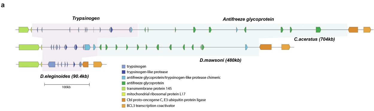 a) Comparación genómica entre D.eleginoides y D. mawsoni. Las regiones de alta similitud entre los segmentos genómicos de D.eleginoides y B se representan como líneas codificadas por color para cada cromosoma. Los cromosomas de D.eleginoides se ubican en la parte superior y los cromosomas de D. mawsoni en la parte inferior. (b) Región de la familia de genes AFGP. Se compararon las ubicaciones de los genes dentro de la región de la familia de genes AFGP de dos haplotipos de D. mawsoni y D.eleginoides. Se codificó por color según el tipo de gen y la orientación de la flecha reflejó la orientación del gen. La posición de cada gen en el genoma se mostró en la misma escala. Las regiones de los genes tripsinógeno y AFGP se codificaron por color..(Haga clic en la imagen para agrandarla)