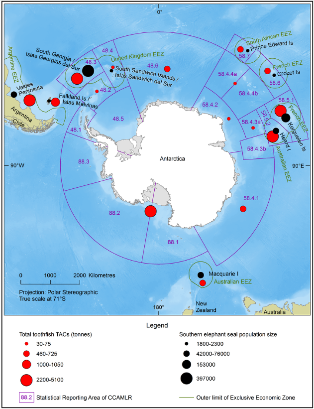 Capturas totales permisibles (CTP) de bacalao de profundidad (Dissostichus eleginoides) y estimaciones de población de elefante marino del sur (Mirounga leonina) Proyección polar del hemisferio sur que muestra los límites de la Comisión para la Conservación de los Recursos Vivos Marinos Antárticos (CCRVMA), las zonas económicas exclusivas (ZEE) nacionales, las CTP de bacalao de profundidad dentro de las regiones de la CCRVMA (burbujas rojas), las estimaciones de población de elefante marino del sur (burbujas negras) y la batimetría oceánica (sombreado azul; claro = poco profundo). Figura producida por el Centro Australiano de Datos Antárticos (c) Commonwealth of Australia 2016.Fuente: Researchgate