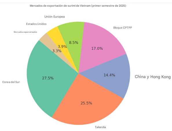 Vietnam ha diversificado con éxito sus exportaciones de surimi a numerosos mercados más pequeños o emergentes, muchos de los cuales están experimentando un crecimiento de tres dígitos. Ejemplos notables incluyen los Emiratos Árabes Unidos (un aumento del 470%), Mauricio (un aumento del 261%) y Nueva Zelanda (un aumento del 1,171%). Esta tendencia indica un potencial significativo sin explotar si las empresas pueden adaptar los productos a los gustos específicos de cada mercado. Sin embargo, la escala actual de estos mercados nicho aún no es suficiente para compensar posibles obstáculos en mercados más grandes como EE. UU. o la UE.
