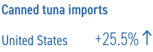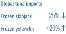 Durante el período de revisión del primer trimestre de 2025, las importaciones globales de atún listado congelado fueron un 25% más bajas interanual, con 261,700 toneladas, pero aumentaron para el atún aleta amarilla (+20% con 145,668 toneladas). Entre los cinco principales mercados, las importaciones disminuyeron en Tailandia (-14.10%) y Vietnam (-8%), pero aumentaron en Costa de Marfil (+50%), Filipinas (+33.33%) y Japón (+19.35%).