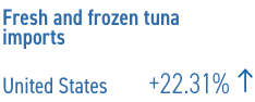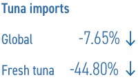 Específicamente para el volumen de importación global de atún fresco, el déficit interanual fue del 44.80% en comparación con el período correspondiente en 2024. Entre los cinco principales mercados (Estados Unidos de América, Tailandia, Portugal, Japón y Francia), las importaciones aumentaron en Estados Unidos y Francia, pero cayeron en los otros mercados. Las importaciones de atún entero congelado, que generalmente se destinan a la conserva (excepto en Japón), disminuyeron en contraste con los filetes de atún congelado de alto valor, que aumentaron un 9.3% interanual; los principales importadores de filetes de atún congelado durante este período fueron Japón, Estados Unidos, España, la República de Corea y Portugal.