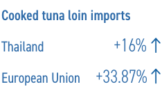 En los últimos años, las conserveras de atún en Tailandia han seguido reemplazando el atún entero congelado por lomos congelados cocidos semiprocesados para su procesamiento en productos finales, en línea con lo que ha estado ocurriendo en las plantas de conserva de atún en Europa. Las importaciones de lomos cocidos en Tailandia aumentaron un 16% interanual a 39,479 toneladas durante enero-junio de 2025, provenientes principalmente de China, Indonesia y Vietnam. Las importaciones de atún entero congelado durante este período se redujeron un 25% a 377,223 toneladas, de las cuales el 70% correspondía a atún listado, seguido por el aleta amarilla con un 20%.