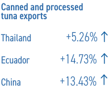 En el período de revisión, las exportaciones de atún enlatado de Tailandia aumentaron un 5.26% en comparación con el primer trimestre de 2024; también se notaron aumentos significativos para Ecuador (+14.73%), China (+13.43%) e Indonesia (+12.80%). El crecimiento de las exportaciones en Ecuador, China e Indonesia se atribuyó al aumento de los suministros de lomos de atún congelados cocidos a las conserveras europeas.