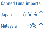 Japón es el mayor mercado de importación de atún enlatado en la región de Asia-Pacífico. Durante el primer trimestre de este año, las importaciones de atún enlatado en Japón aumentaron un 6.66% a 16,518 toneladas en previsión del aumento de la demanda en verano. Australia mostró una tendencia más débil en las importaciones durante enero-marzo de 2025 con 11,900 toneladas, que es casi la misma cantidad importada el año pasado. Las importaciones en Malasia aumentaron un 6% a 2,245 toneladas.