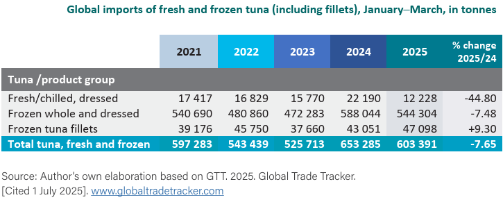El comercio internacional de atún fresco y congelado durante enero-marzo de 2025 totalizó 603,391 toneladas, una disminución del 7.65% en comparación con el mismo período del año anterior. Esto se debió a una menor demanda de atún fresco de alto valor y de materia prima entera congelada utilizada en productos procesados, preparados y en conserva.