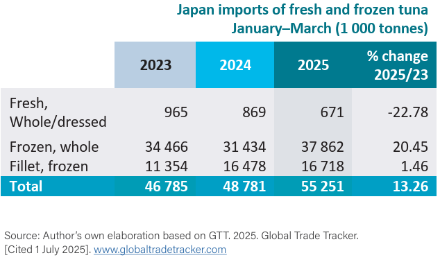 .png) During January–March 2025, Japanese imports of fresh and frozen tuna, including fillets, increased by 13.26 percent year-on-year to 55,251 tonnes, which was the highest volume in five years. This positive trend continued into Q2 2025, bringing the total import volume in the first half of 2025 to 148,904 tonnes (131,606 tonnes in H1 2024). Of this trade, 60–70 percent comprised higher-value non-canned tuna. The main users were supermarkets and the catering trade (restaurants, sushi outlets, and family-style restaurants).