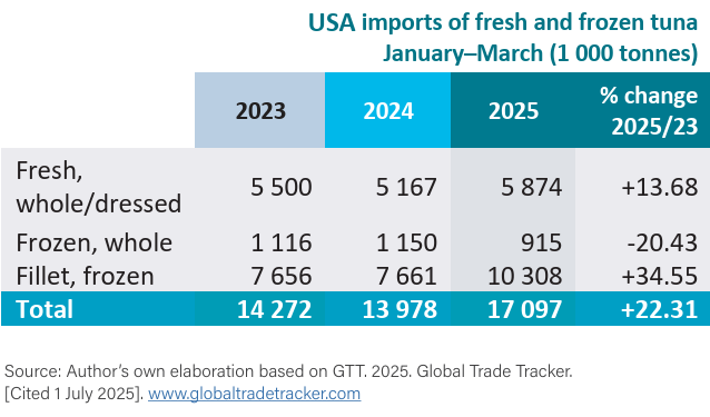 La demanda de los consumidores por atún de alto valor en el mercado estadounidense está en aumento, y en el primer trimestre de 2025, el país se mantuvo como el mayor importador mundial de atún fresco transportado por vía aérea. Se importaron un total de 3,220 toneladas de atún aleta amarilla, atún rojo (1,500 toneladas) y atún ojo grande (937 toneladas; 747 toneladas en el primer trimestre de 2024) desde México, Panamá, Brasil, España y Costa Rica.
