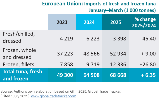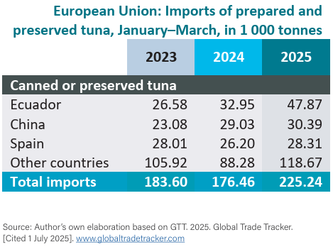 Durante enero-marzo de 2025, se importaron a la Unión Europea 83,808 toneladas de lomos de atún congelados cocidos, un 33.87% más que en el mismo período de 2024. China tuvo la mayor parte de este suministro (36%; 30,349 toneladas); los otros principales proveedores fueron Indonesia (18%; 15,392 toneladas) y Ecuador (12%; 9,869 toneladas). Se observó un fuerte aumento interanual del 84% para Indonesia.