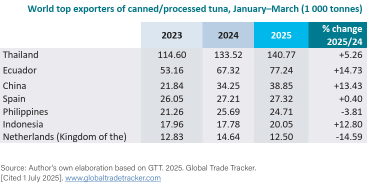 El comercio internacional de materia prima semiprocesada (lomos congelados cocidos) y atún preparado listo para consumir (código HS 160414) alcanzó un máximo de cinco años con 454,000 toneladas durante el primer trimestre de 2025, un aumento del 25% interanual. La participación estimada de materia prima semiprocesada (lomos congelados cocidos) en este comercio fue de casi el 23%, cuyos principales compradores son las conserveras de atún en Europa y Tailandia.