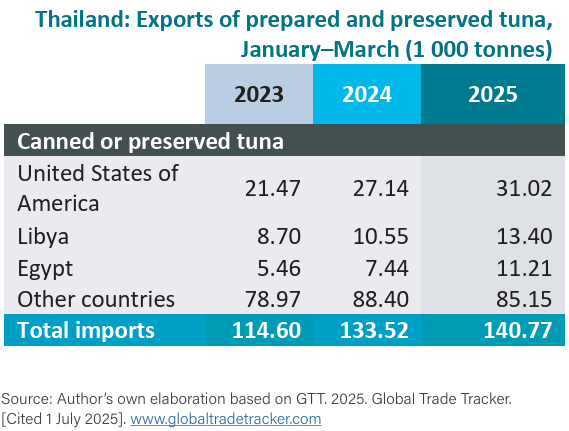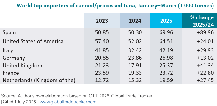 En general, la demanda de los consumidores por atún listo para consumir ha sido fuerte en los países productores de Europa. Durante el primer trimestre de 2025, el comercio intra-UE de atún procesado se registró en 65,000 toneladas, incluidas las reexportaciones de lomos cocidos. Fuera de la Unión Europea, los otros mercados tradicionales en el continente son el Reino Unido y Suiza.